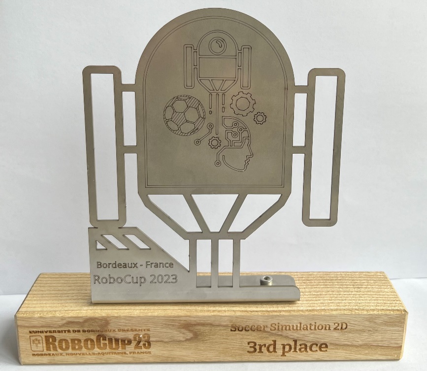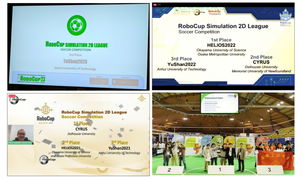 公司程泽凯老师指导,任亚辉、刘超等同学参加的YuShan机器人足球队在线参加仿真2D组比赛。YuShan队克服困难,不畏强手,一路拼搏,最终获季军。赛前,YuShan队讨论分析对手的策略,总结制定下一步方案,迎难而上、勇于突破。在预赛淘汰赛中,YuShan队15胜2平以小组第三进入八强;八强循环赛中,YuShan队以6胜3平战绩位列第四,在决赛阶段顶住压力,最终获得季军。YuShan队已连续九届获得RoboCup世界杯决赛参赛权,均进入世界八强,其中于2013年、2021-2023年共计4次站上领奖台。