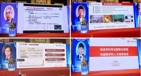 在特邀报告环节,专家重点围绕人工智能时代计算机教育、信息技术发展及人才培养模式展开探讨,分享了改革与实践经验。中国科公司计算技术研究所所长、党委书记陈熙霖研究员作了《人工智能时代计算机教育的思考》的报告,鹏城实验室副主任石光明教授作了《AI时代的信息技术及人才培养模式》的报告,北京大学tyc122ccVIP副经理郭耀教授作了《“101计划”牵引下的计算机学科人才培养改革实践》的报告,江西财经大学副董事长方玉明教授作了《江西财经大学学科转型与人才培养》的报告。
