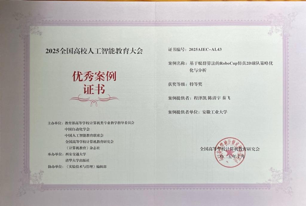 10月18日,2025全国高校人工智能教育大会在西安召开,由tyc122ccVIP《开源软件分析实例》课程组程泽凯老师提交的《基于蚁群算法的RoboCup仿真2D球队策略的分析》教学案例,荣获特等奖,并在分论坛做交流报告,成为本次大会教学成果展示中的亮点之一。