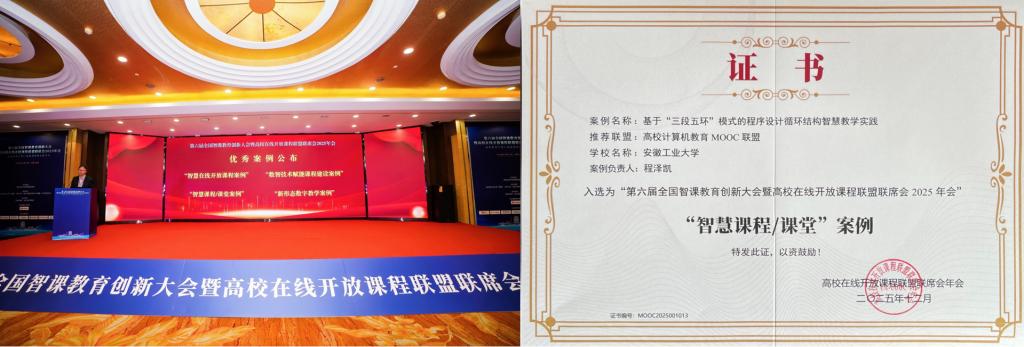 12月13日,第六届全国智课教育创新大会暨高校在线开放课程联盟联席会2025年年会在武汉召开。副经理程泽凯参加了此次会议,公司高级语言程序设计课程团队提交的《基于“三段五环”模式的程序设计循环结构智慧教学实践》获“智慧课程/课堂”优秀案例。本次会议由高校在线开放课程联盟联席会主办,哈尔滨工业大学(威海)、湖北大学等承办,中教全媒体等协办。